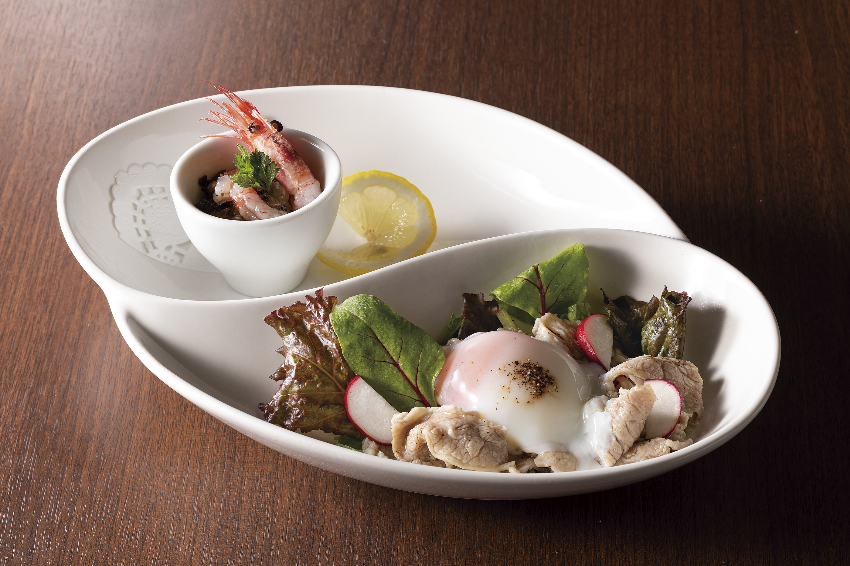牛肉のポッシェ 御殿卵添え サラダ仕立て