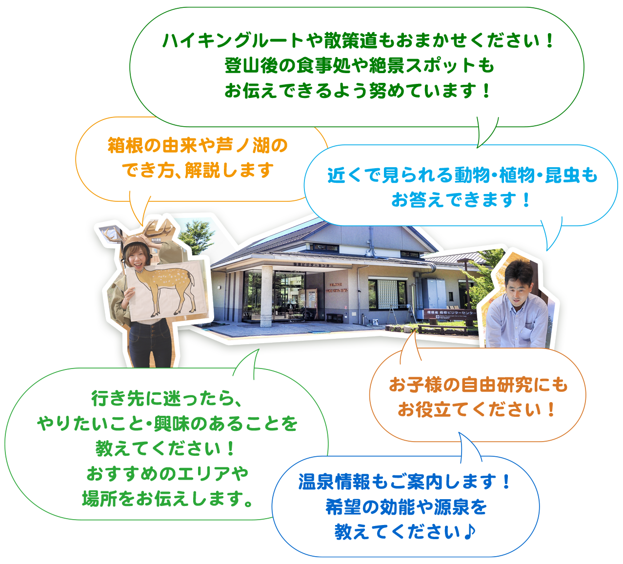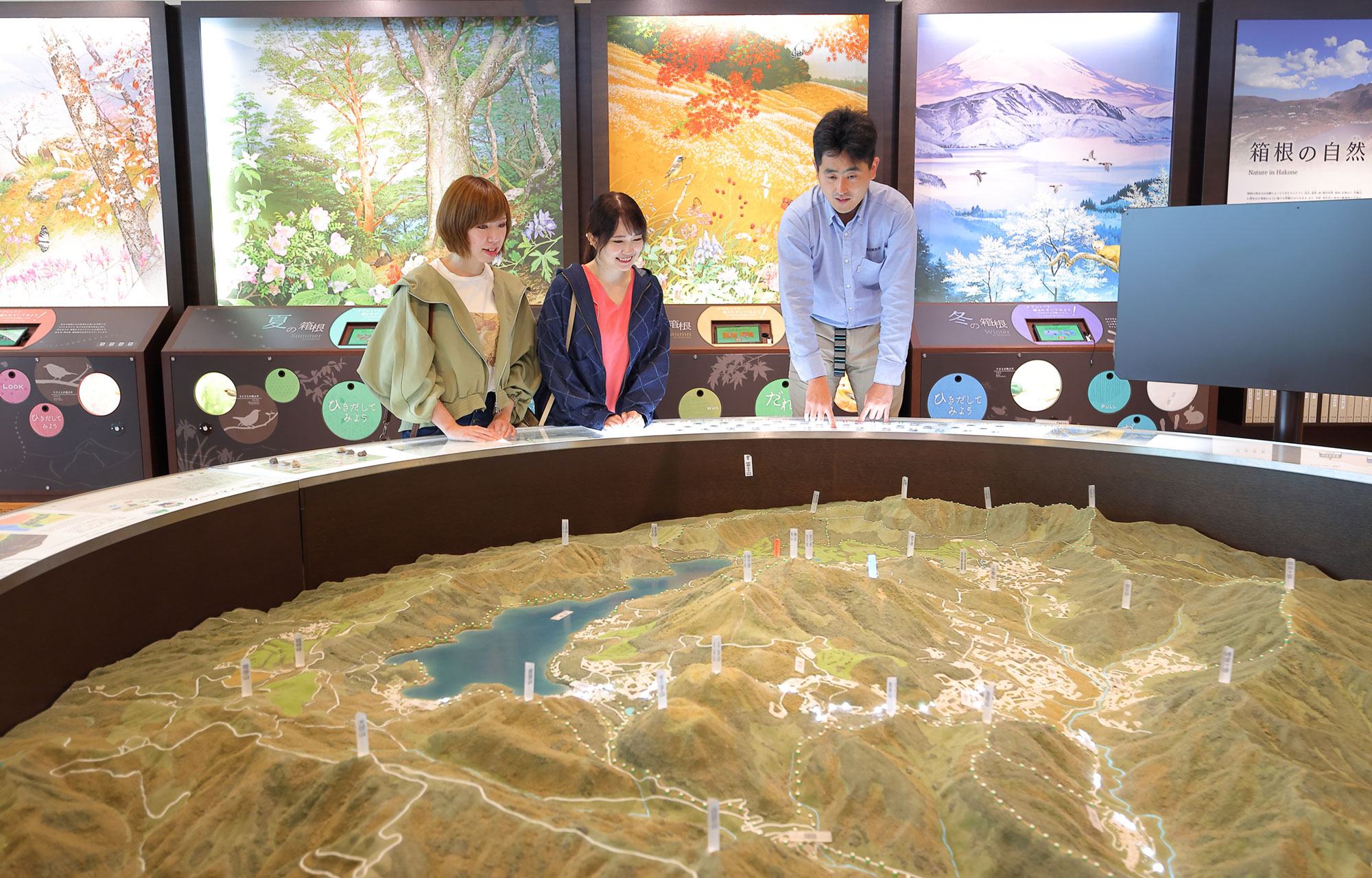 富士箱根伊豆国立公園や箱根の歴史をはじめ、ハイキングコースや温泉・観光に関する情報提供を受けられます。