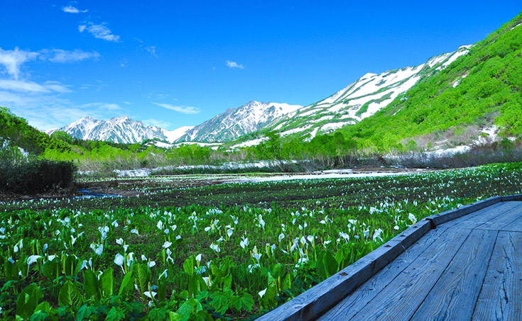 栂池自然園には、数えきれないほどの多くの高山植物が生息しています。 本州でもっとも遅咲きのミズバショウの群生が見られる他、イワカガミ、ニッコウキスゲ、チングルマなどの高山植物が代わる代わる姿を現します。