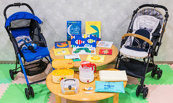 フロントではベビーカー、おねしょシーツ、絵本や補助便座等の貸し出しも行っております。お気軽にお声掛けください。