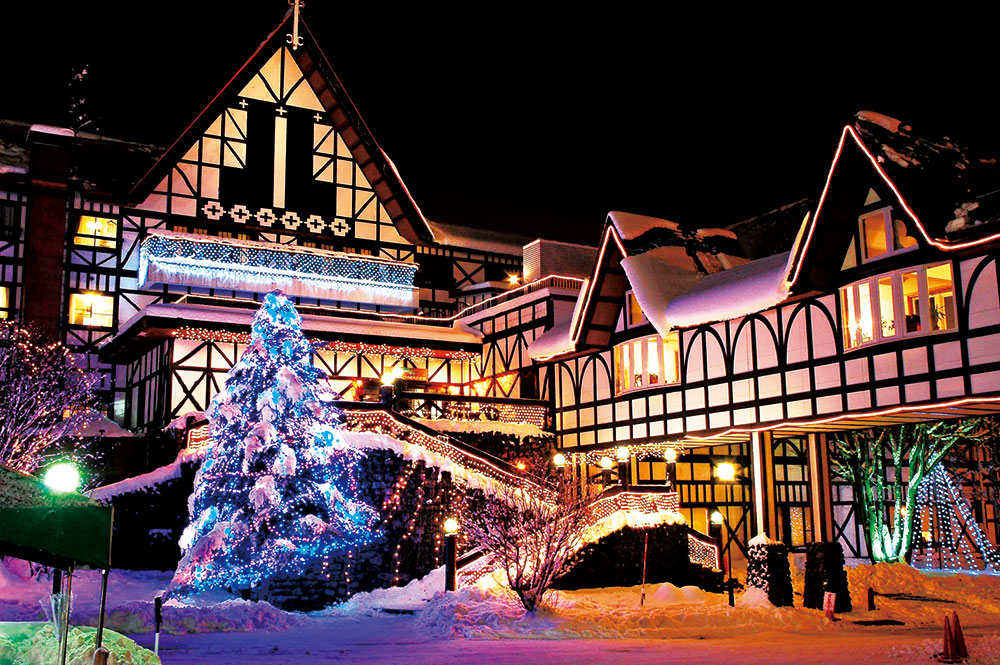 ホテルの赤三角屋根の雪と光が創る幻想的な世界をお楽しみいただけます。ホテル正面では存在感のあるツリーがお出迎え。中にはでは通路を色とりどりのイルミネーションが綺麗です。この冬の思い出の1枚を♪