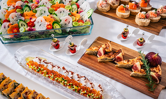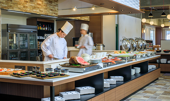メインレストラン「マジョリカ」の中央に位置するラブキッチンでは、低温調理で仕上げたローストビーフに加え、焼きたて、揚げたてのメニューをライブ感を持ってお楽しみ頂けます。