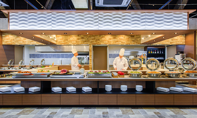 迫力あるライブキッチンや、季節の食材を使った多彩なメニューなど年齢を問わずファミリーでお楽しみ頂けます。